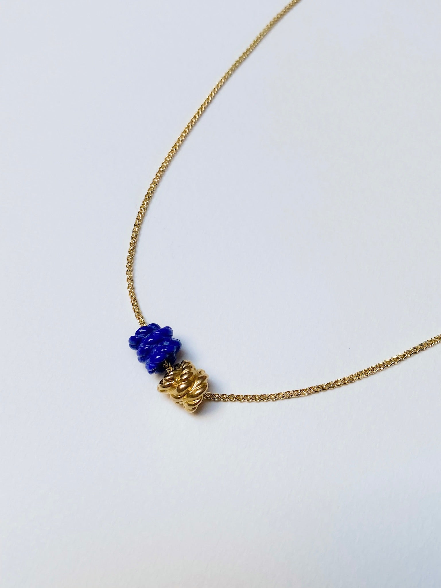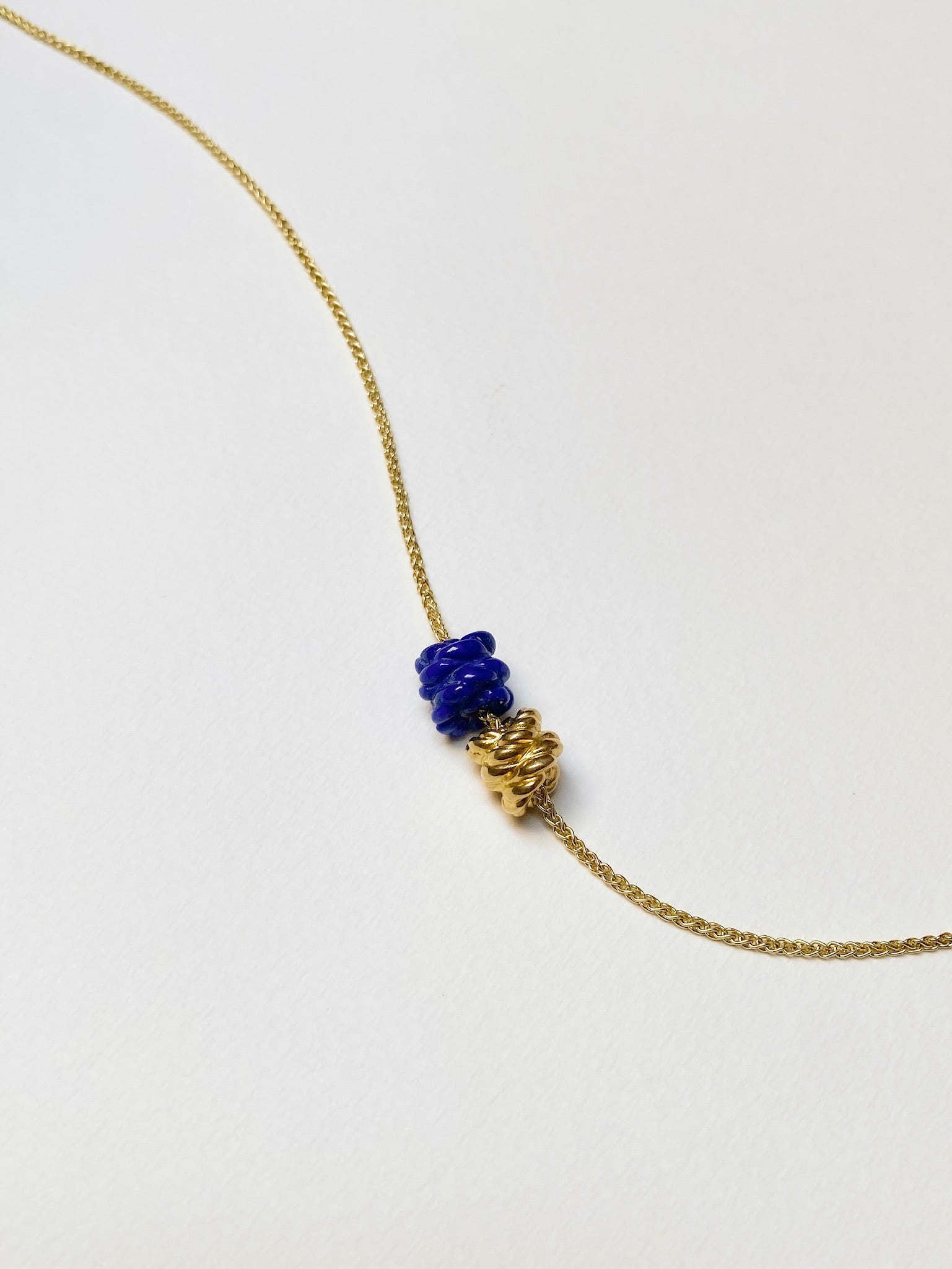 A larger version of the classic Duo necklace. One hand-carved Lapis Lazuli knot and one solid warm 22k gold knot couple together on a 16" 18k gold chain.