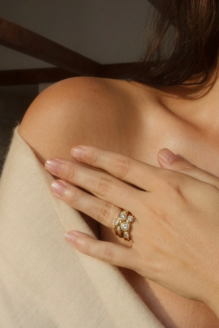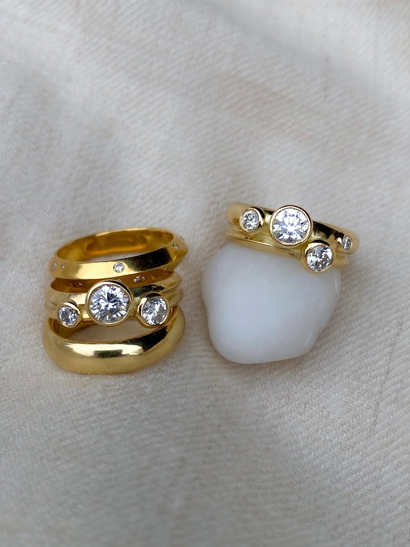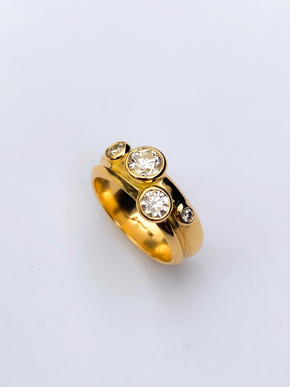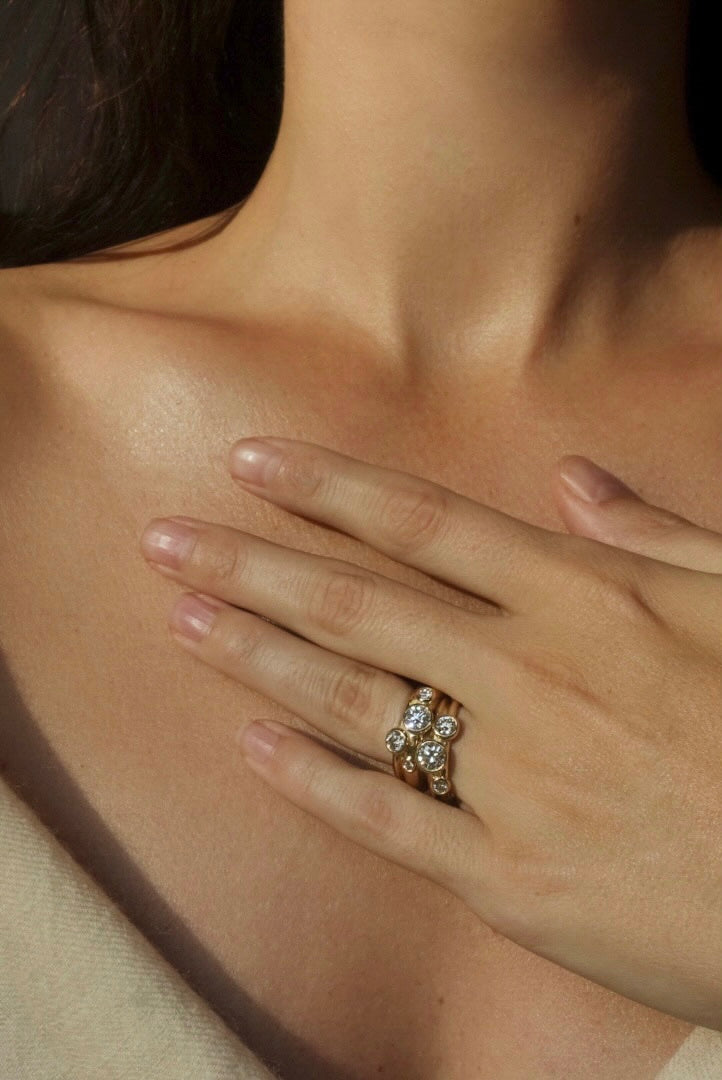 Four brilliant white diamonds set atop our signature dual band — two individual gold bands bonded as one. One ridged, one curved. A meaningful ring for ceremony, partnerships, or self-adornment.