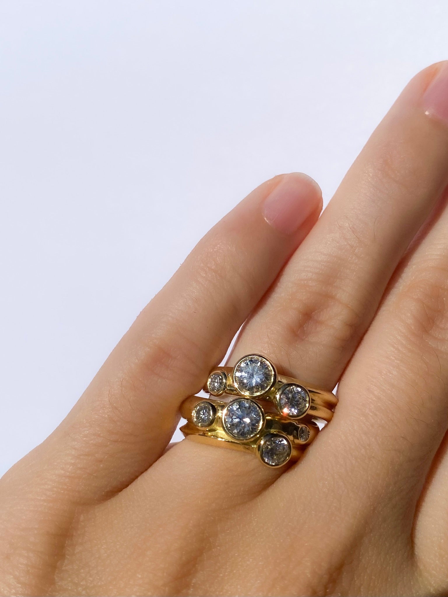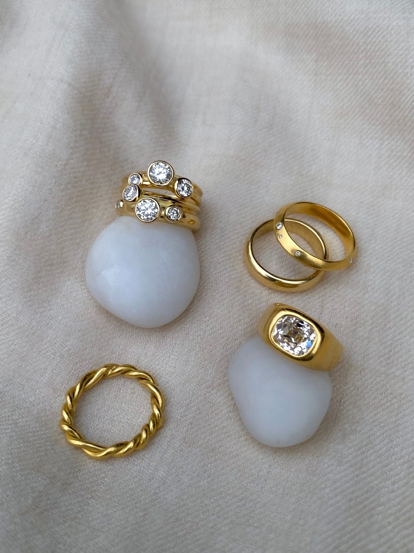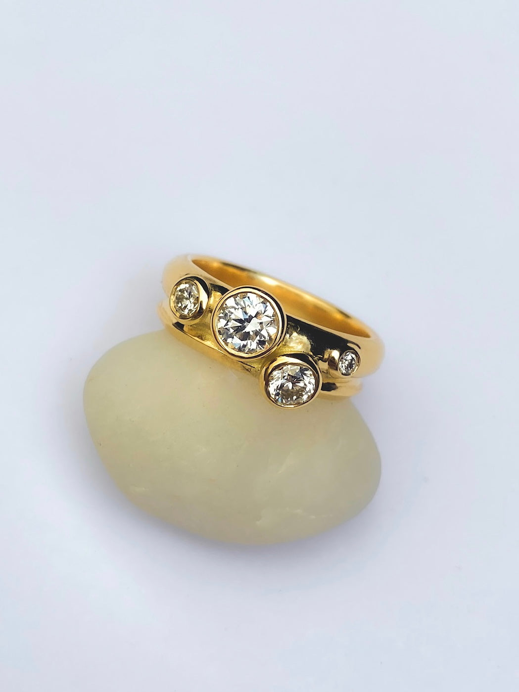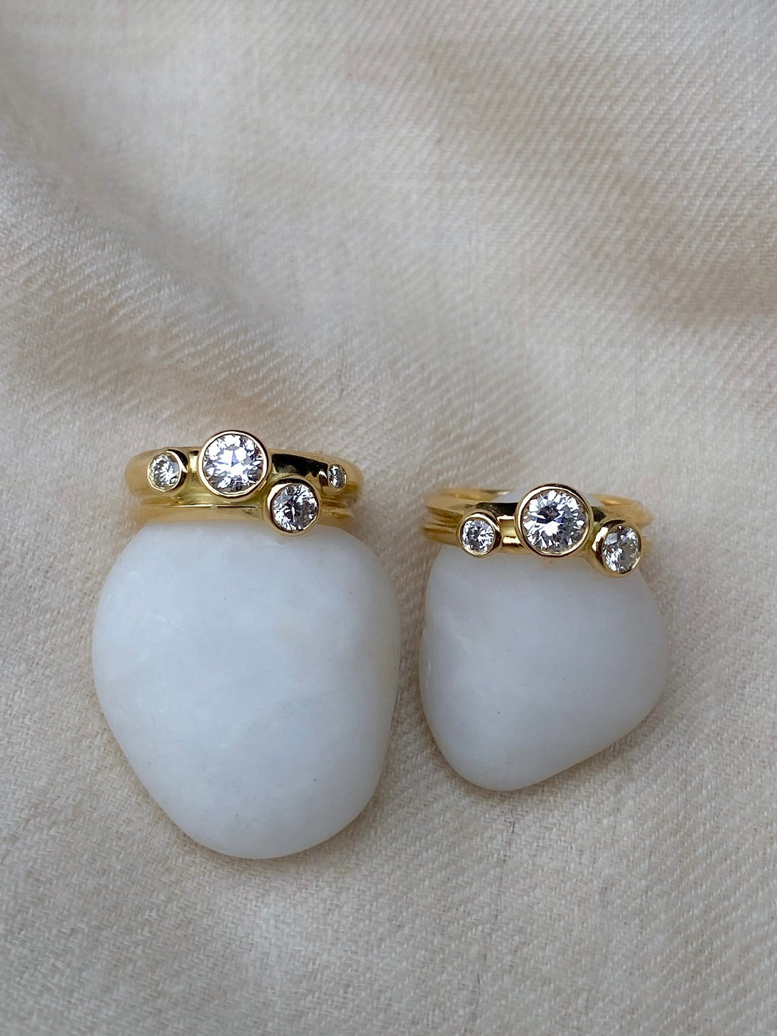 Four brilliant white diamonds set atop our signature dual band — two individual gold bands bonded as one. One ridged, one curved. A meaningful ring for ceremony, partnerships, or self-adornment.