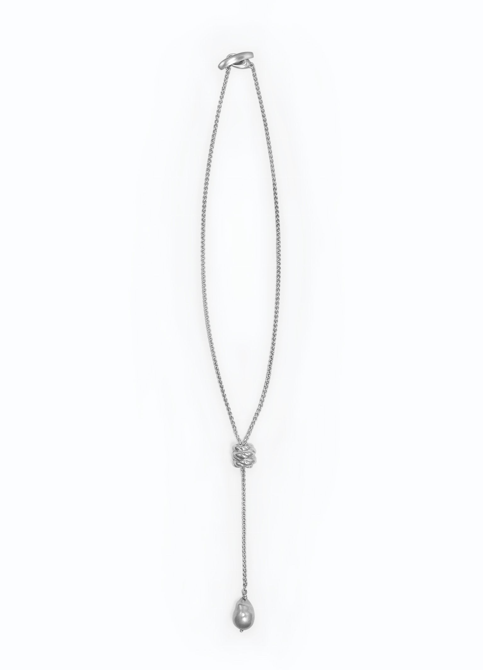 This lariat necklace is fully adjustable as the pearl chain can be pulled longer or shorter through the cast metal knot as the knot and pearl are perfectly balanced.